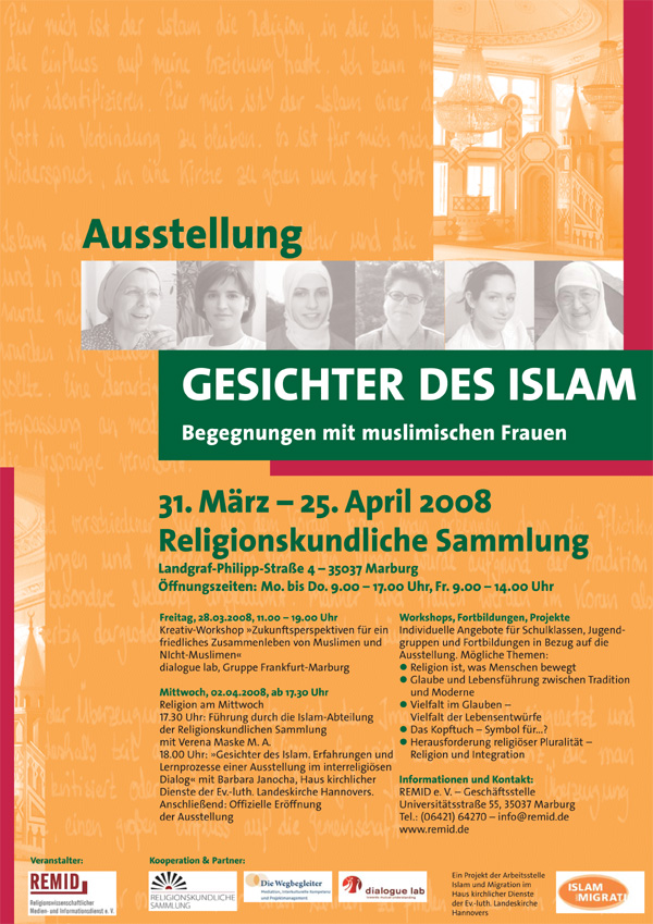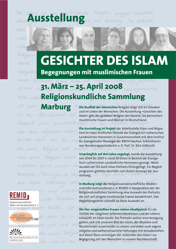 Plakate und Flyer für die Ausstellung "Gesichter des Islam" in Marburg. Für die Ausstellung existierten Vorlagen, die für die lokalen Zwecke angepasst wurden. Das REMID-Plakat wurde neu gestaltet.
