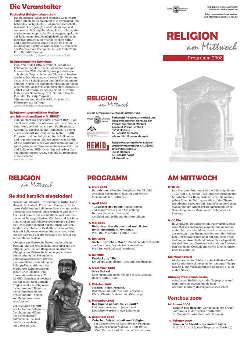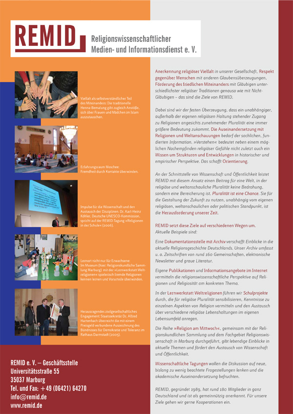 Zusätzlich zur neuen Homepage wurde in gleichem Layout Ende 2008 ein Flyer gestaltet, mit dem das REMID-Archiv beworben wird.