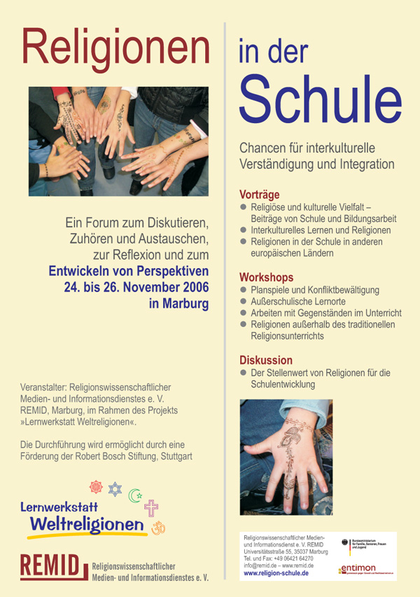 Tagungshomepage des Religionswissenschaftlichen Medien- und Informationsdienstes e. V. REMID. Die Tagung "Religionen in der Schule" fand Ende November 2006 in Marburg statt. Zur Information verbleibt die Seite bis auf Weiteres im Netz.